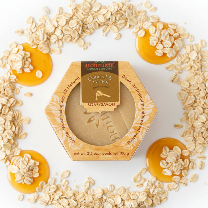 Indispensable pour les démangeaisons cutanées, ce savon contient de l'avoine biologique cultivée dans les Maritimes et du miel provenant de nos ruches d'arrière-cour à Four Corners Apiary.